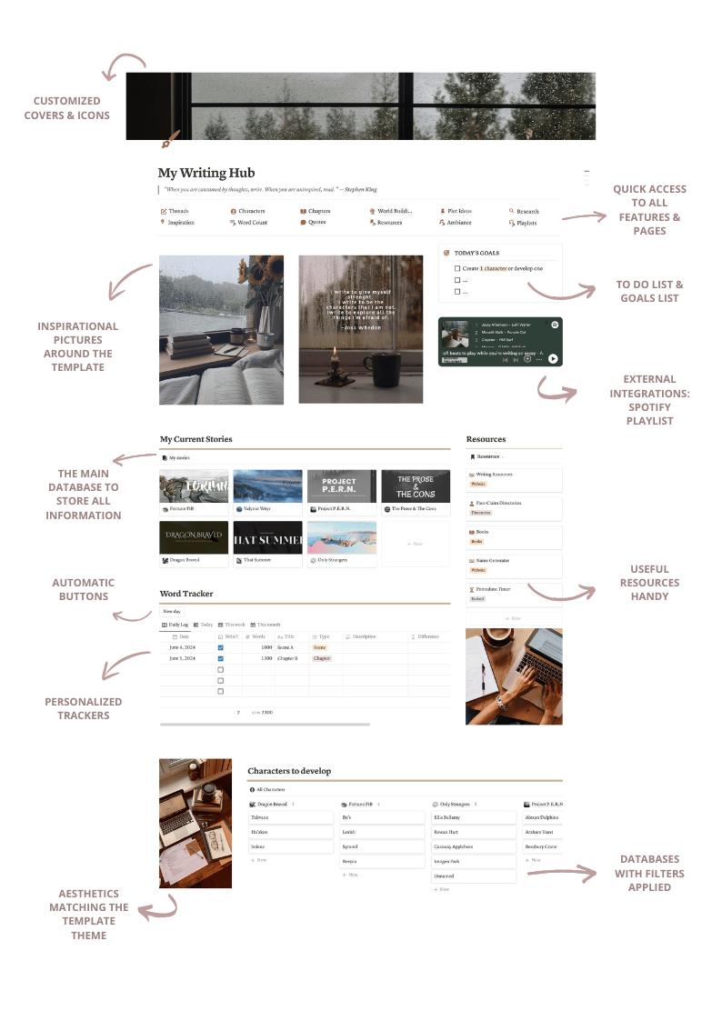 📖 Chapters Tracker | 🧑🎨 Character Tracker | 🌎 World-Building Hub | 💡 Quotes & Inspiration Sections | 🎭 Plot Ideas & Ambiance Links | 🎵 Playlist Manager | ✍️ Word Tracker
