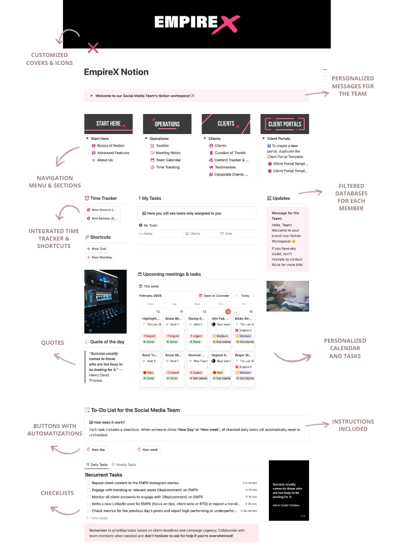 EmpireX, a digital marketing agency, needed a structured Notion workspace to enhance collaboration, improve task management, and streamline client workflows.